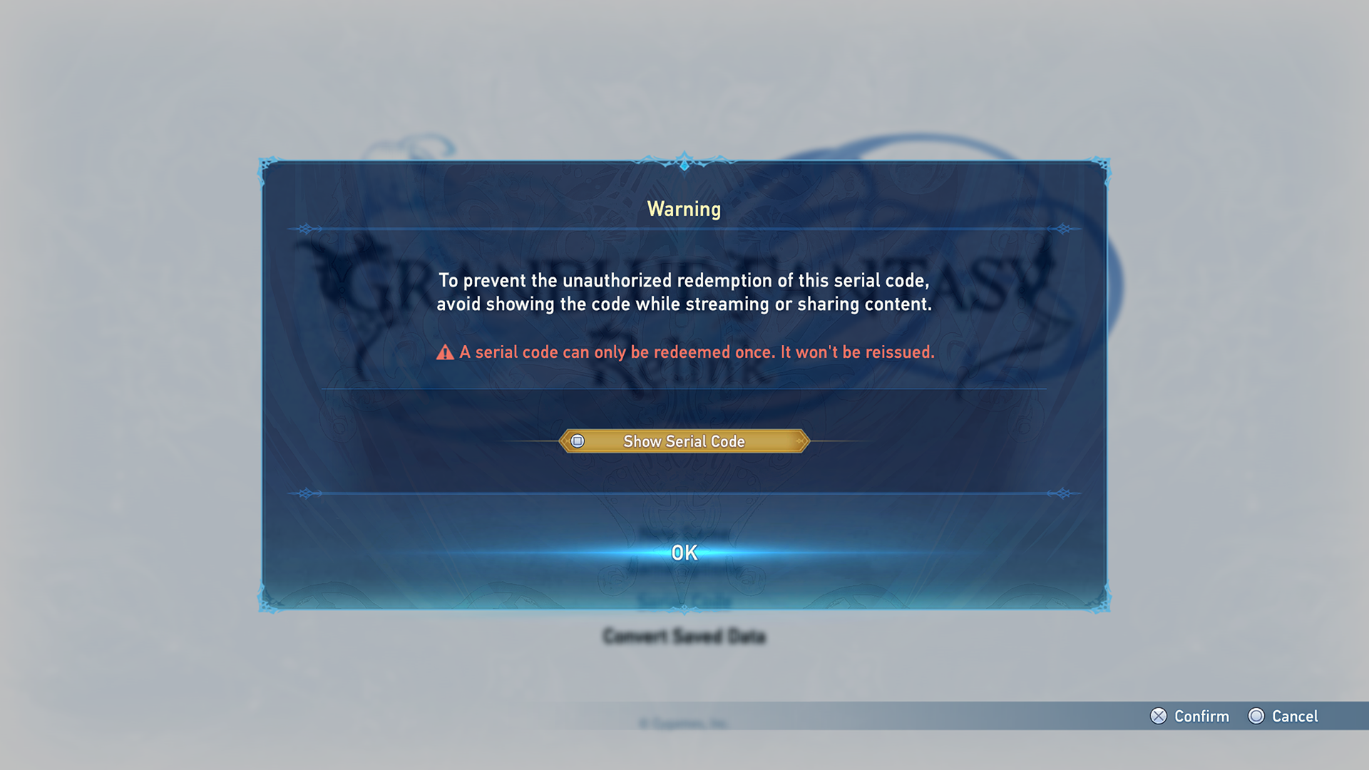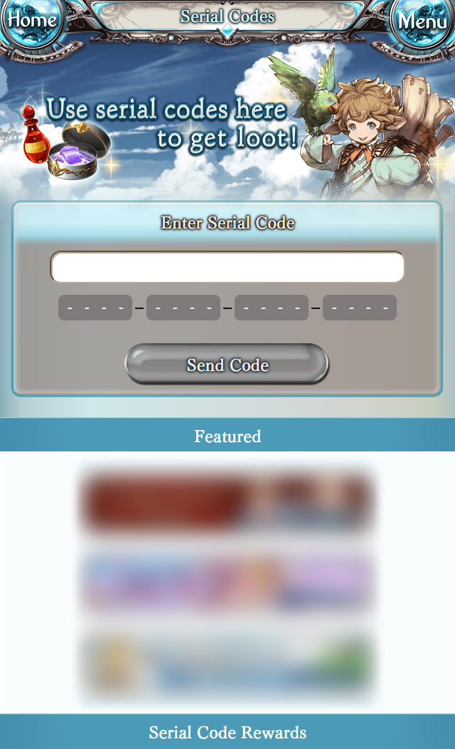 * Serial codes cannot be entered in the iOS version of the Granblue Fantasy app. Please log in to your Granblue Fantasy account using a browser to enter your serial code.